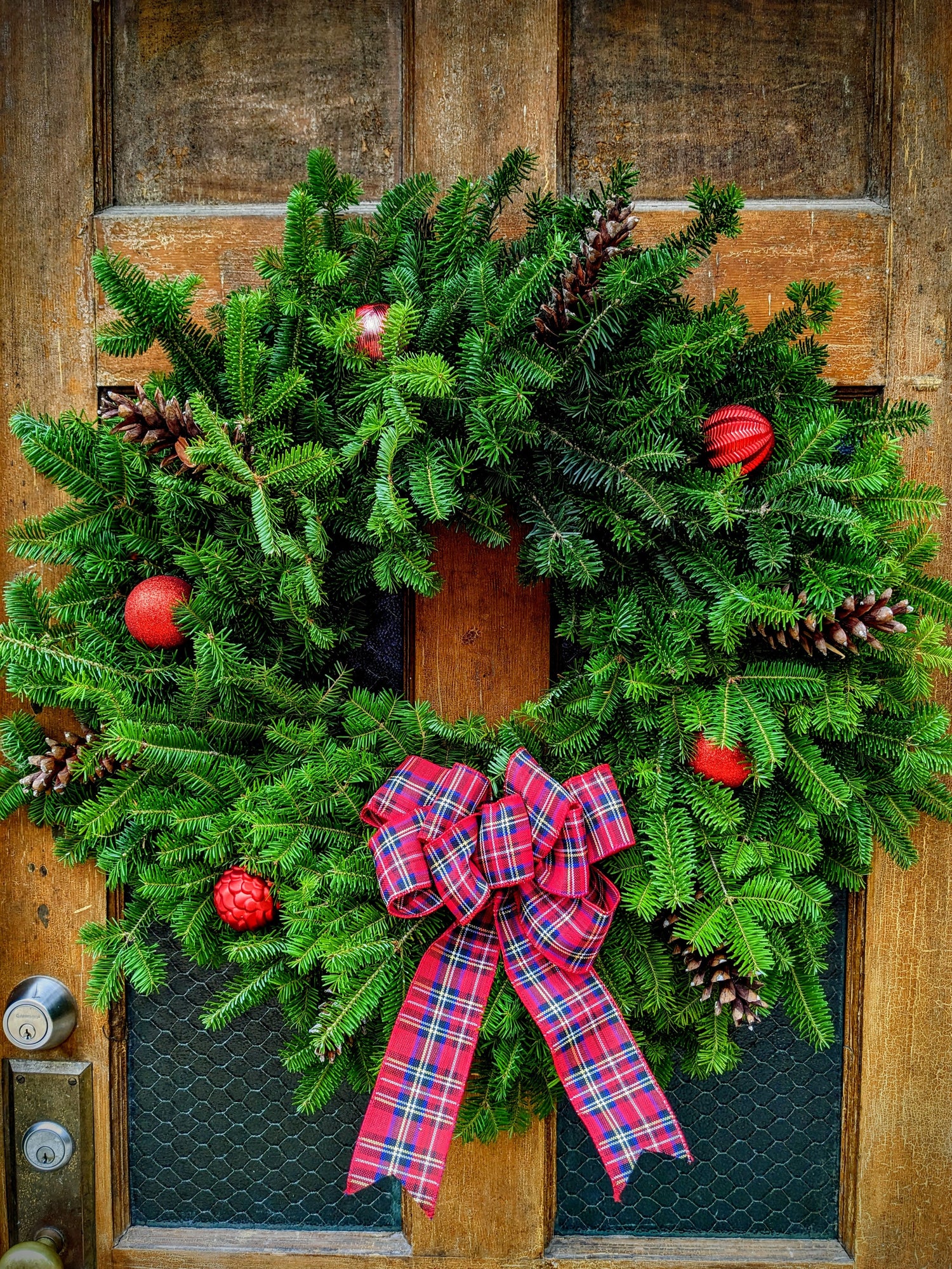 Nothing quite says Christmas better than a traditional balsam fir wreath. Our wreath comes in two sizes - either 22 or 26 inches, complete with white pine cones, red ornaments and a cotton linen bow.