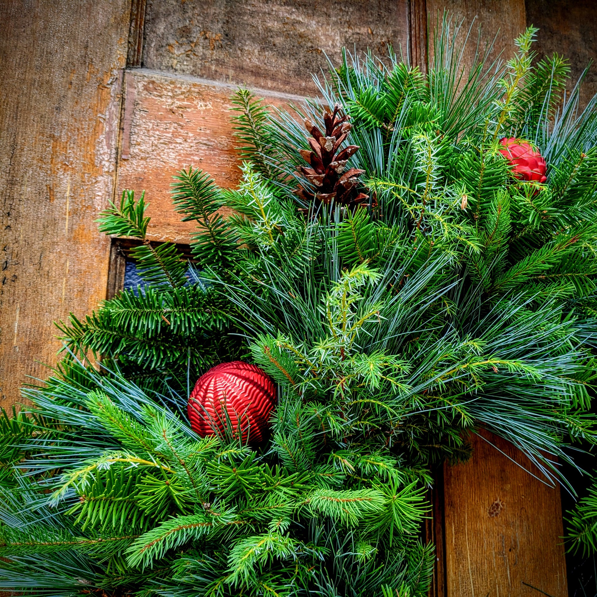 A beautiful representation of the Acadian Forest in Nova Scotia with natural balsam fir, white pine, blue spruce and juniper. This wreath is luscious and full and a real show stopper.
